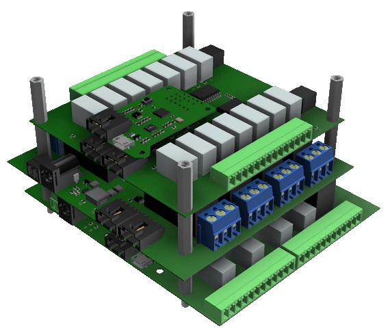 IOBrick module boards are designed to be connected together to depending on which board is needed for solve a specific control requirement, no more, no less.